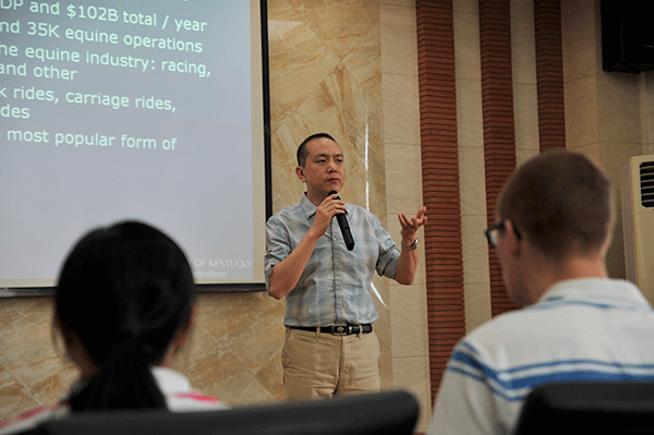 5月20日上午,胡武阳教授又为师生做了一场题为“Rider Preferences and Economic Values for Equestrian Trails”的精彩讲座,在这次讲座中,胡教授向大家介绍了一种新颖的研究方法“选择性试验(Choice Experiment)”。他以肯塔基州马行业中骑行项目有最大比重的用马量却只占来马行业经济价值的5.6%??与全美国数据恰好相反这一现象为切入点,由浅入深引出主题。首先,他设定马骑行路线具有七种特质,而这七种特质可以有1024种组合,再利用正交分析出12种代表性的偏好组合,接着再设计调查问卷进行数据的收集,最后通过模型的估计发现:骑行路线中的景色(View)和路线是否仅供骑行者使用(Distance to travel to the trail)这两种特质对骑行路线有十分显著的影响。在随后的现场提问环节中,胡武阳教授就“问卷填写者是否认真填写”、“样本容量不够大”、“从1024种组合中正交分析出12种组合带来的信息缺失”等问题作了详细的解说。