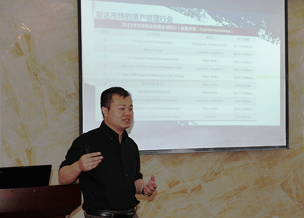张学勇博士首先介绍了最近十年发达国家的资产管理行业和我国资产管理行业的发展现状,特别是美国对冲基金行业规模七年之内近十倍的惊人增幅,他认为资产管理行业将是我国未来金融的下一个风口。目前,我国的资产管理规模已经位居世界前列,资产管理行业发展日趋成熟,资产管理规模呈螺旋式上升,今后十年我国的资产管理行业将处于蓬勃发展时期。随后,张博士从动量策略、价值策略、配对交易、事件驱动等四方面结合美国学界和业界的实践,详细分析了资产管理投资策略的理论与实践问题,他强调,我们在做资产投资决策时应该由合理的投资理论模型做支撑。讲座之后,张博士与师生们就实践投资过程中需要注意的问题以及如何解决这些问题进行了深入交流。