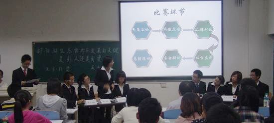 此次辩论赛的主题是:“鄱阳湖生态经济区发展的关键是引人还是引资”,赛程由开篇立论,阐述立场,二辩对话,双方盘问,自由辩论和总结陈词六部分组成。正方是来自11级国民经济管理班的队伍,所持观点为“引资”。反方是来自11级经济学1班的队伍,所持观点为“引资”。双方辩手就己方所持观点自信满怀地陈述,争锋相对的辩论,让整个辩论现场都沸腾了起来。整场比赛高潮迭起、精彩纷呈,双方辩手都不甘势弱,旁征博引,力求压倒对方论点。辩手们巧妙地辩论、精辟的话语,引来台下的阵阵掌声,让大家看到了11级新生的个性与朝气。