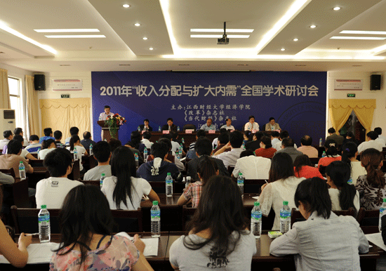 2011年5月27日,由江西财经大学经济学院、《改革》杂志社和《当代财经》杂志社联合主办的2011“收入分配与扩大内需”全国学术研讨会在风景如画的江西财经大学蛟桥园举行。副校长易剑东教授、校长助理王小平教授、科研处处长严武教授莅临大会,副校长易剑东教授代表学校致欢迎词。参加研讨会的有国家发展改革委员会社会发展研究所杨宜勇所长、《改革》杂志主编王佳宁教授、中国人民大学孟捷教授、南京大学经济学院葛扬教授等国内知名学者及其他高校科研机构的二十多位学者。经济学院院长陈富良教授、副院长廖卫东教授、副院长席小炎副教授以及部分教师参加本次研讨会。研讨会期间,代表们就收入分配与扩大内需的相关问题进行了系列主题报告和讨论。杨宜勇所长作了“‘十二五’期间收入分配的改革理念和工具选择”的专题报告和主题发言,分析了为什么要研究收入分配、为谁研究;收入分配改革中的压力与难点,以及未来收入分配改革的重点等。王佳宁教授以“中国区域经济新格局与区域差异”为题作主题报告,在介绍中国区域经济的新格局以及区域差异的基础上,提出了缩小差距的四大方略。孟捷教授对农民工的半无产阶级化问题进行了深入的分析。葛扬教授就中国房地产发展的特殊路径及其问题进行了分析。下午,会议代表继续就相关的问题展开了激烈的圆桌讨论,会议取得了圆满的成功。