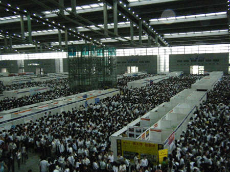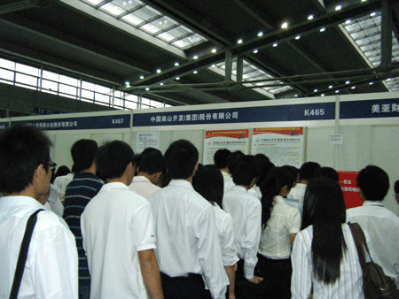 据了解,400多家单位进驻“双选会”现场,并提供近2万个就职岗位供毕业生挑选。据主办方统计,当日进场应聘人数超过15万人次,比去年增加5万多。上午10点,在双选会现场看到,会展中心1号馆2万多平米的空间内,密密麻麻的挤满了求职者。参展单位中的知名企业展台前异常火爆,都是大排长龙,尤其是银行区??中国银行、兴业银行、工商银行等深圳所有银行展台前聚集了大群人,短短的二三十米距离,要走半个小时才能穿行!另外,去年地产业是大热门,但今年房地产业处于低谷期。现场看到,仅有几家地产公司参加“双选会”,且提供的职位不多,这一现象使涉及地产专业的就业生受到一定程度的影响!据了解,2009年全国普通高校毕业生将超过600万人,但受金融危机的影响,就业机会将有所减少。不少应届毕业生表示,鉴于目前的环球金融形势,愿意降低薪水要求!