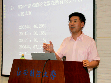 黄泰岩教授首先对财经期刊进行排名,分析了前十五名经济杂志并进行分类,以及把经济学的具体知识放到中国企业中运用,分析所谓的“剩者为王”和以人为本等。然后对中国的热点问题排名,通过比较历年的排名,强调论文所选内容的热点性。黄教授主要对今年的前二十个热问题进行具体分析及地位比较,即一为资本市场;二为经济增长与发展;三为“三农”问题;四为货币政策;五为外贸及其政策;六为公共经济;七为国情发展;八为区域经济;九为制度创新;十为商业银行;十一为经济学基本理论问题;十二为就业问题;十三为政府规制;十四为收入分歧与差距;十五为外商投资;十六为时政体系;十七为企业成本;十八为企业政策;十九为人力资本,二十为汇率。黄教授精僻的言语、严谨的逻辑层次、深入浅出的演讲艺术展现出了其在专业领域高深的造诣以及对现实问题深刻的理解,博得了大家热烈的掌握,赢得了无数道敬佩的目光。(阮艳平)