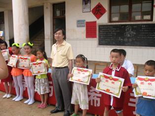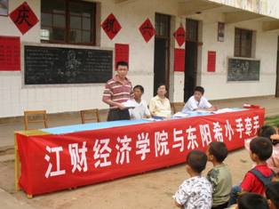 接着进行了“江西财经大学经济学院与安义东阳希望小学手牵手”大会。大会中吴书记作了重要发言,他讲到,他代表经济学院776名学生表达对东阳希望小学的关爱,衣物、募捐款只是一点小小的心意,更多的是让孩子们明白不要因为贫穷而丧失了斗志,要努力学习,成为国家的栋梁之材。吴书记还鼓舞孩子们:你们比远在千里之外的汶川孩子们幸运,所以在和平的环境里一定要珍惜美好时光,学好知识,展翅翱翔!希望小学的刘开佑校长讲到,他代表东阳希望小学所有人向十几年来对东阳给予支持、给予温暖的江西财经大学经济学院表示衷心的感谢。他说,在各级政府和有关部门的指导下,在经济学院的关心和帮助下,学校的各个方面都取得了很大的进步。为不辜负经济学院的期望,今后一定会更加加强学校管理,加大改革力度,让东阳有一个新台阶!在捐赠仪式中,吴书记和郭老师分别为七名获奖学金的学生和七名获助学金的学生颁发了奖状、奖金。在致经济学院的感谢信中,他们写道;“看着孩子们接到奖状时庄严的行礼,看到孩子们拿到奖学金时欣喜而自豪的面容,我们万分感动。自1998年以来,江西财经大学经济学院就与我校建立了爱心助学关系,执着的关怀十几年如一日,让我们倍感亲切。奖、助学金的注入不仅缓解了某些学生经济上的困难,激发了他们的斗志,更重要的是,这份爱心将在学生们幼小的心灵中植根发芽,为他们以后成为真正对社会有用的人打造稳固的基石。”大会结束后,吴书记、郭老师等人与刘开佑校长道别,刘校长再次表达了深深的感谢!