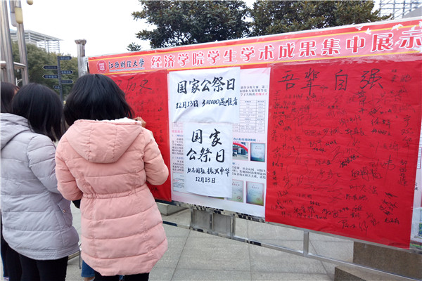 习近平总书记在十九大报告中指出,中国“始终做世界和平的建设者、全球发展的贡献者、国际秩序的维护者”。经济学院举办“国家公祭日”悼念活动,不但是要唤醒同学们对历史的记忆,也是对和平的向往与坚守,更是对同学们牢记历史、振兴中华的激励。铭记历史,更图自强,江财学子在路上。(文/经济学院 黄锡琦)