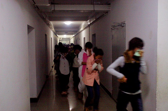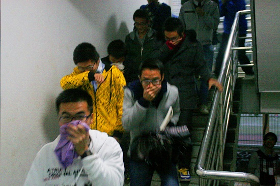 在阵阵烟雾中,本次消防演练正式开始,现场真实模拟失火场景之地,组织人员们第一时间冲到每个寝室前,用力敲门,带领同学们快速冲到走廊上,井然有序的排成两队,并用毛巾捂住鼻子,随着常委王宁的一声令下,同学们弯腰快速奔跑,从一楼的一个侧门逃出楼外。随着一楼的女生们安全逃离后,紧接着五楼的男生们也安全逃离。伴着烟雾渐散,本次消防演练结束。