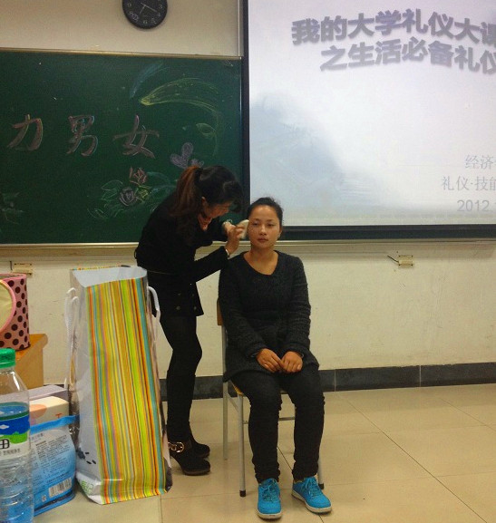两位主持人用自己的热情带动了全场的氛围,观众们都满怀期待。活动分为两个环节:首先由赞助方为大家展示系统的化妆方法和简单实用的化妆技巧,化妆品店陈店长为大家做了现场演示。而且,最让大家兴奋的是,赞助方还特意为观众准备了化妆小礼品,赠送给在场观众。接下来,礼仪部部长简芳芳和她的助手张文静分别从职场着装、餐桌礼仪、家庭礼仪、交通出行礼仪和交际礼仪这五个方面进行了相关知识介绍,为大家普及礼仪知识。