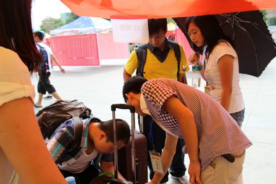 校园里迎新工作如火如荼进行,到处都是忙碌的身影。当新生们坐着校车到达学院报到处,学院就有一位对口班的学长或学姐迎上去,主动帮着拎行李,全程指导陪伴新生办理入学手续、领军训服装,带领新生去寝室,并在路途中细心的解答新生的问题,传授一些生活经验。