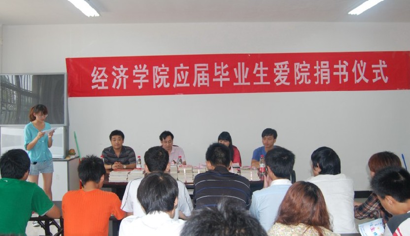 2011年6月14日下午,江西财经大学经济学院应届毕业生爱院捐书仪式在经济学院党团活动室举行。参加此次活动的有经济学院党总支副书记吴太福、分团委书记郭勇、辅导员曹雯以及应届毕业生代表和在校学生代表。