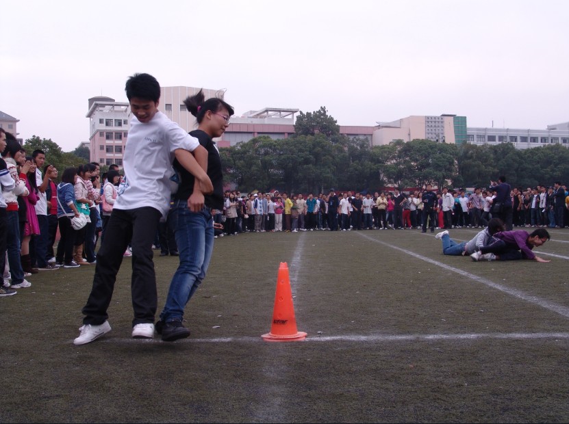 此项目是由一男一女用背夹住一个球绕场一周完成比赛.发令枪一响,运动员就大步向前飞跃着,两人默契的配合,天衣无缝,出色的完成了第一圈.良好的开端是成功的一半,在第一组完美开头的带动下,其余各组也默契配合,最终夺下第八名.