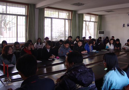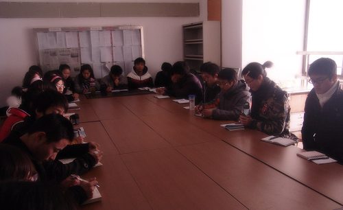 走访国贸学院是在12月30日,临近元旦。在国贸学院狭小的党员活动室里,我们与之相聚一堂。国贸学院的全体学生干部几乎全部到齐,小小的党员活动室里略显拥挤,但却让人倍感温暖。双方主席分别介绍了自己学院的特色活动,而后各自畅所欲言,国贸学院介绍了自己宣传秘决,经济学院也分享了自己的大合唱致胜法宝……少了份拘束,多了份亲和,室内不时爆发出朗朗笑声。