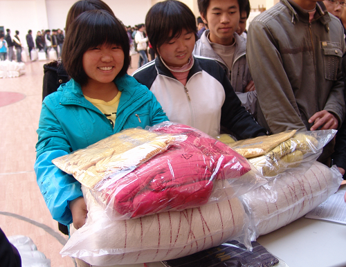 致辞后,贫困学生依次上前从领导手中领取发放物品(包括一床被子、一件棉袄、一件毛衣),领导及勤工部人员根据学生体型分别发放大号或小号的衣服。发放活动以班为单位有条不紊地顺利进行,同学们怀抱着一件件发到他们手中的棉衣棉被等御寒物资都无比感动和喜悦!