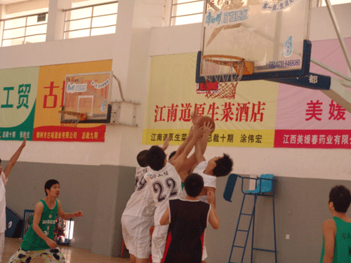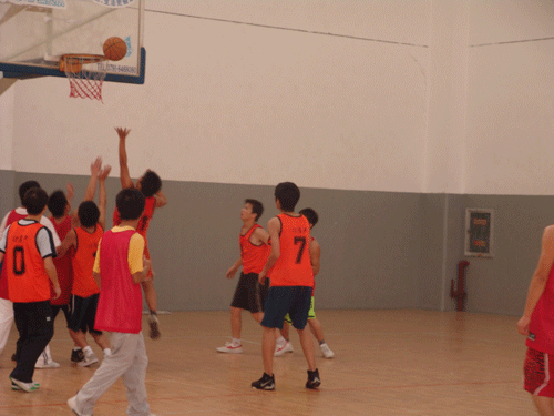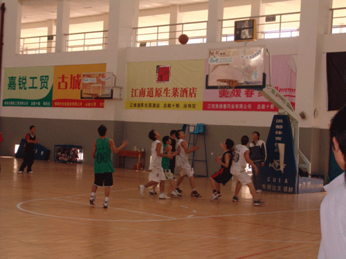 11月29日下午开始了我们院的夺冠之赛。比赛一开始,身穿绿色队服的05经(2)就以5:0的小高潮向所有人宣布了他们夺冠的实力和信心,然而稍加调整,06工程便利用自己犀利的突破迅速将比分赶上,在开场5分钟便以8:7领先对手。落后的05经(2)也没有慌乱阵脚,而这短短的几分钟,06工程由于犯规,多次将对手送上罚球线,依靠较好的罚篮命中率和00号的突破以及11号强打内线,硬是把比分改写成12:14,06工程又回到落后的局面,当06工程的队员充分认识到这一点,他们加强了后场防守,成功的抢断了四次,并迅速将比分改写成20:17,此后双方都是你投一个我回敬你一个,最后,06工程一26;25一分的优势结束上半场。