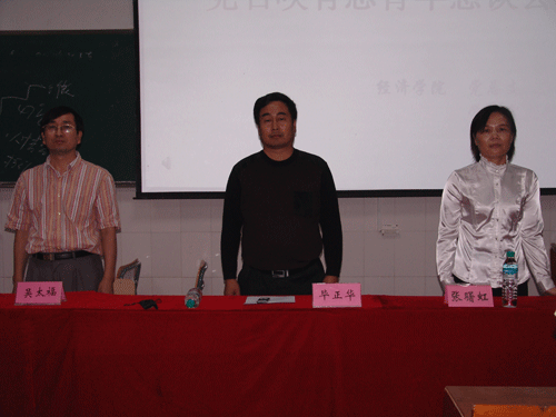 为了弘扬党的精神,经济学院于2008年10月23日下午4点在4121举行了“党召唤有志青年恳谈会”,与会的嘉宾有经济学院党总支书记毕正华教授,副书记吴太福副教授,干事、学生党支部书记张曙红老师等。