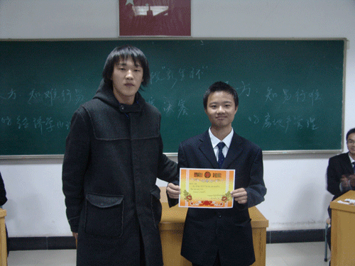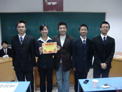 最后,经过评委认真评判,正方08房地产管理队获得胜利,最佳辩手为正方二辩康宜俊。经济学院分团委书记郭勇老师、学生会主席张惠临为获胜方和最佳辩手颁奖。