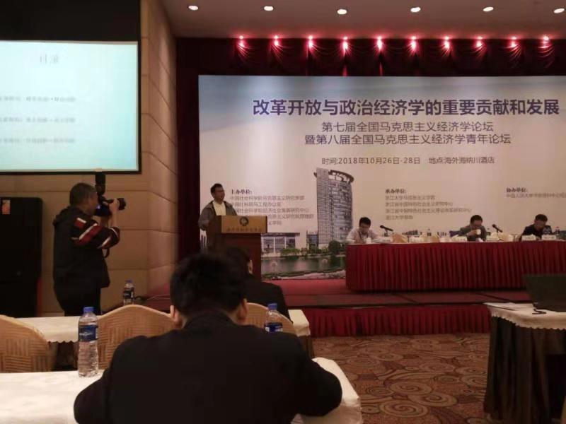 刘爱文老师应邀参加第七届全国马克思主义经济学论坛暨第八届全国马克思主义经济学青年论坛 时间:2018-11-08 08:26:57 作者: 阅读: 为纪念马克思诞辰200周年、《共产党宣言》发表170周年和中国改革开放40周年,进一步推动马克思主义政治经济学对现实问题的解释和应用,并结合时代变化与世界经济最新发展,丰富完善马克思主义政治经济学理论,由中国社会科学院马克思主义研究学部主办、浙江大学马克思主义学院承办、中国人民大学书报资料协办的“第七届全国马克思主义经济学论坛暨第八届全国马克思主义经济学青年论坛”于2018年10月26-28日顺利在浙江大学召开。出席此次会议的200多位专家学者分别来自中国社会科学院、浙江大学、清华大学、南京大学、中国人民大学、南开大学、四川大学、中山大学、武汉大学、西南财经大学、华中科技大学、中央财经大学、江西财经大学、吉林财经大学、太原科技大学、辽宁经贸学院、浙江海洋大学、中共福建省委党校、中共杭州市委党校、福建师范大学、哈尔滨工业大学、辽宁大学、西南大学、中国人民银行等全国多所知名高校及科研机构。本次会议围绕“马克思主义政治经济学基本原理及其当代价值研究”“习近平新时代中国特色社会主义思想研究”“技术变革与社会发展的政治经济学研究”和“青年马克思主义学者(硕博)研究论坛”等主题展开了热烈的讨论。应会议主办方邀请,江西财经大学经济学院刘爱文老师作为中青年代表在10月28日的闭幕式上作了“新时代我国科技创新三重路向及其历史内涵诠释”的主题报告,引起了与会代表的热烈讨论,会议期间,刘爱文老师还同全国各大高校从事政经教育事业的青年同行们进行了广泛而深入的交流。 上一篇:东北农业大学经济管理学院张永强一行来我院调研交流 下一篇:我院学子在首届全国高校经济学综合博弈实验大赛取得佳绩