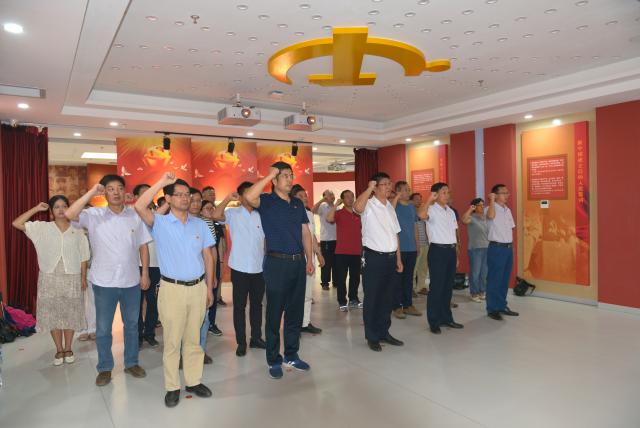 在宣誓厅前,全体党员面对鲜红的党旗,庄严地举起右手,重温入党誓词,庄严宣誓:“我志愿加入中国共产党,……,永不叛党。”胸前的党徽闪闪发光。