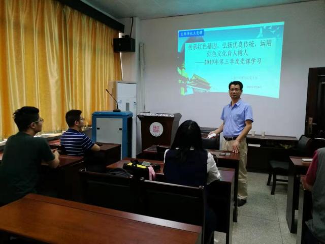 党支部书记黄和平强调:传承红色基因,弘扬优良传统,运用红色文化育人树人,一是要做好宣传教育引导,扣好人生第一粒纽扣,强化广大青年学子对红色文化的思想认同;二是要引导广大青年在学习、传承红色文化中端正价值追求。引导广大青年学子在弘扬优秀红色传统文化中铸牢忠诚品质。每一处革命遗迹、每一件珍贵文物都是鲜活的教材,都折射着革命先辈崇高理想、坚定信念、爱国情操的光芒;三是提高红色文化学习的质量,拒绝形式主义。抓住改革开放40周年、“五四”运动100周年、新中国成立70周年等重要节点,广泛开展“不忘初心,牢记使命”主题教育。