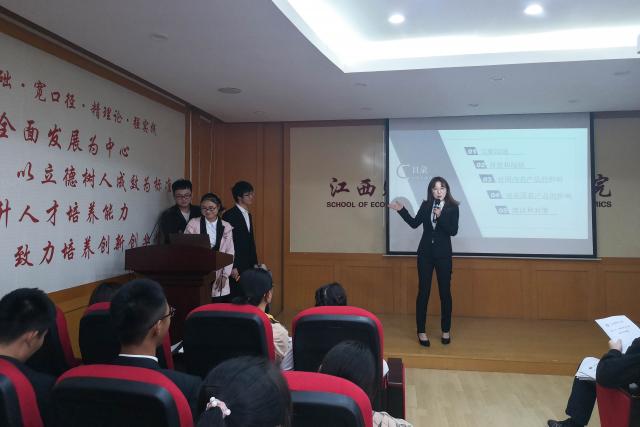 活动开始,主持人介绍了举办本次大赛的背景,目的及流程。接着,进入正式比赛环节,各参赛小组以演示文稿的形式依次展示并讲解自己的选题。其中,较为出彩的是06013小组选择的“猪肉价格上涨”的话题,该小组不仅对选题现状做出了具体分析,还对该问题的未来发展做了预估和判断,这充分运用了经济学的预估性。06006小组带来以“双十一活动”为主题的选题展示,抓住不久前双十一的“盖楼”和优惠券等促销活动,分析了此现象中包含的经济学理论知识,揭示了“双十一”购物狂欢节背后的乱象,呼吁同学们要理性消费。05046小组同样以“双十一”作为切入点,但更侧重于从整体角度分析“双十一”购物狂欢节所带来的经济效益,以及造成的资源浪费,交通运输拥堵等问题。同样精彩的还有04021小组所探讨的“视频付费不断增多,红利却不断减少”的问题,05035小组带来的“人工智能背景下财经专业大学生就业形式分析”选题展示和02005小组展示的“人口老龄化对我国的经济影响”话题,还有许多十分新颖的话题如“新能源汽车的补贴政策”,“炒鞋热”等各式各样的选题被展示出来。
