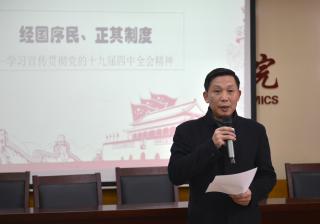 12月4日下午,十九届四中全会精神宣讲团成员罗世华教授为我院全体教职工带来了以“经国序民,正其制度”为题的学习宣传贯彻党的十九届四中全会精神宣讲会,宣讲会由党委书记邹春发主持,李大晖、杨飞虎、李国民、胡德龙等60余位老师参加本次宣讲会。