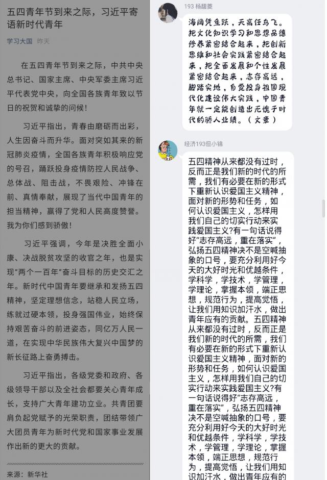 五四青年节到来之际,习近平总书记寄语新时代青年,向青年一代致以问候和鞭策。5月4日,经济学院记者团对此展开热烈的线上讨论,同学们就该发言表达了自己的见解,并对于五四青年节的深厚意义表示崇高的敬意。