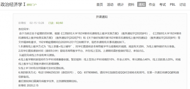 在课程门户和学习通上发布相关的通知。第一,在课程门户发布公告,告知学生本门课程的开课时间、线上教学方式、线上教学平台和辅导平台、线上学习工具、线上成绩比重等重要信息。第二,发布“在线学习临时建群”通知,让学生入群,以更方便与学生取得联系。第三,发布“第1次”上课通知,告知学生第一次上课的时间、上课前要做的准备工作以及强调线上教学的纪律问题。第四,发布“第1次上课的签到通知”,告诉学生在哪个平台签到,什么时间签到。