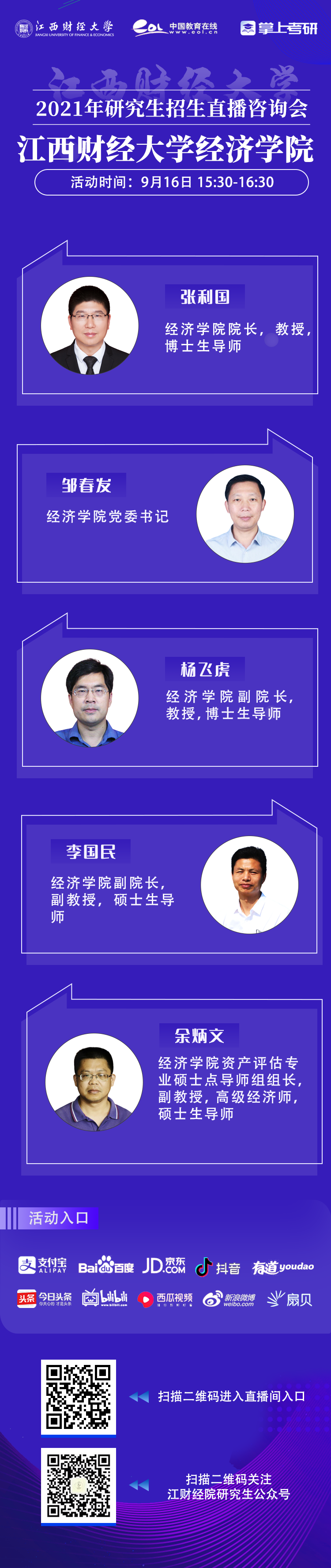 为满足考生对研招咨询的需求,建立多方位的信息沟通渠道,9月16日15:30-16:30,我院联合中国教育在线举办2021年研究生招生网络直播宣讲咨询会。