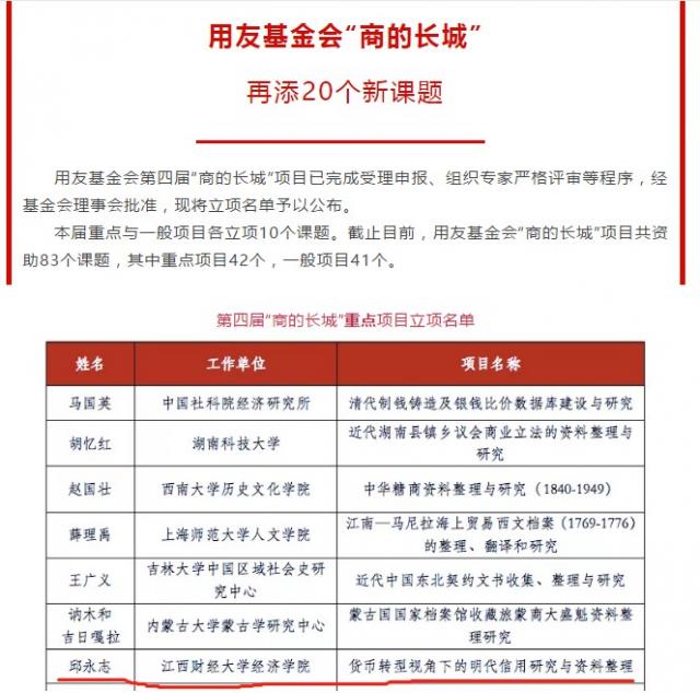 10月28日,北京用友基金会公布第四届“商的长城”项目立项名单。我院邱永志副教授申报的重点项目《货币转型视野下的明代信用研究与资料整理》获批立项。“商的长城”项目系北京用友公益基金会致力于整理与保护中国的商业文化遗产而专门设立的经济史(商业史)横向项目,每年分别立项10项重点项目、10项一般项目,重点项目资助额度为30万元,今年获批立项率约为14%。