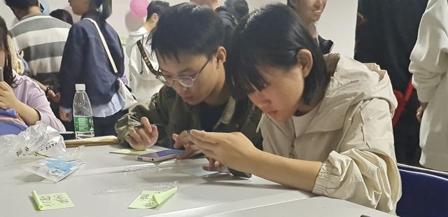 同学们积极参与,努力思索,在活动中解开一个个谜题,留下一道道身影。在想出答案后,同学们与身边的志愿者确认答案,登记猜对的谜题个数。活动现场氛围热烈,同学们思涌如泉,很快猜完了准备的谜题。最后,在同学们的强烈要求下,传文社添加了几十道有难度的新谜题,满足大家的求知欲和参与感。