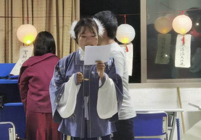 11月7日晚,正值立冬,经济学院传文社于麦庐园大学生活动中心举办猜灯谜活动,主持人身穿汉服,字正腔圆地介绍活动的背景和规则,随后向大家抛出一道关于朱熹的谜题。这激发了同学们的热情和挑战心,活动也正式开始,同学们纷纷散开,各自寻找灯谜。