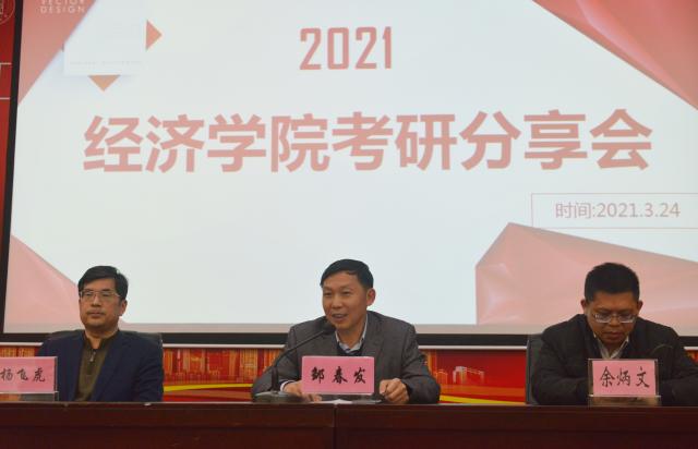 3月24日下午,经济学院在国际学院学术报告厅举行18级学生考研信息分享会,特邀请到经济学院杨飞虎副院长、余炳文副教授和国际处刘小兵副处长为大家介绍学院考研情况、出国深造等情况,指导做好复习,帮助同学们更好地选择院校,提前做好准备。经济学院党委书记邹春发主持分享会。