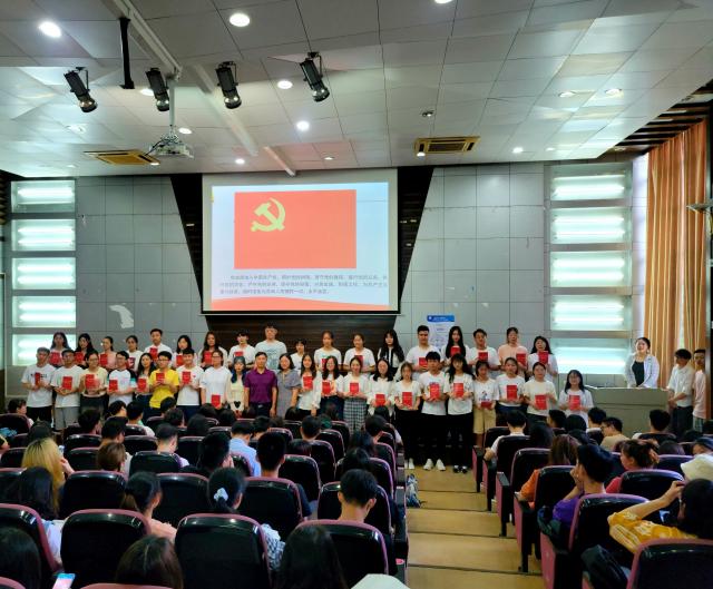 而后,新晋预备党员面向党旗进行宣誓,由万婧怡老师领誓。预备党员高举右手庄严宣誓,同时也激励着在座的每一位入党积极分子努力提升自己,向党组织靠拢。接着,邹春发书记和远翠平副书记给预备党员颁发党员政治生日卡,对预备党员表示祝贺。