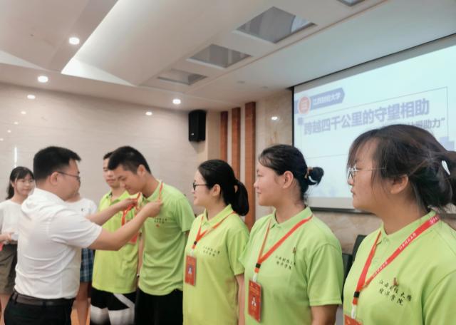 校团委书记夏贤锋为赴疆志愿服务队员颁发工作牌和工作日志簿。