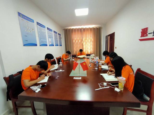 在协助社区开展排查工作之外,实践队成员还利用中午休息时间在社区自发组织开展党史阅读学习活动。大家围坐在长桌旁,聚精会神地阅读手中的党史相关书籍。周围只有书本"簌簌"的翻页声。阅读结束后,在阅读过程中留下思考问题的成员还会积极询问其他成员,吸引大家一起讨论。通过对党史的学习,实践队成员们深刻体会到了当今幸福生活的来之不易,更加佩服革命先驱者的伟大精神,更知党的思想之博大精深。