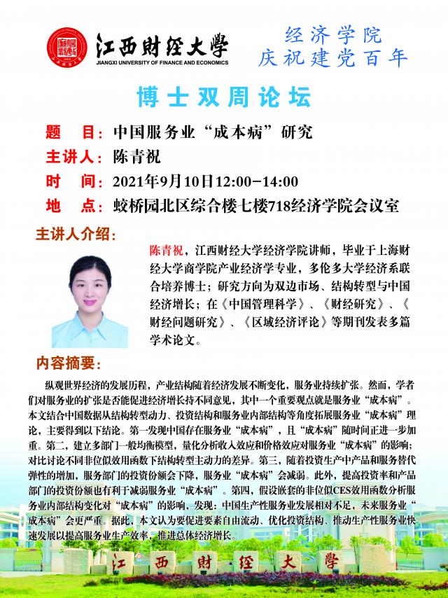 博士双周论坛:中国服务业“成本病”研究 时间:2021-09-08 15:27:52 作者: 阅读: 上一篇:中国农业经济学会食物经济专业委员会2021年学术研讨会暨2021年中国食物经济管理论坛 下一篇:博士双周论坛:The Happiness Science of Air: Pregnant Women Suffer Sentimentally for Ambient Air Pollution in China