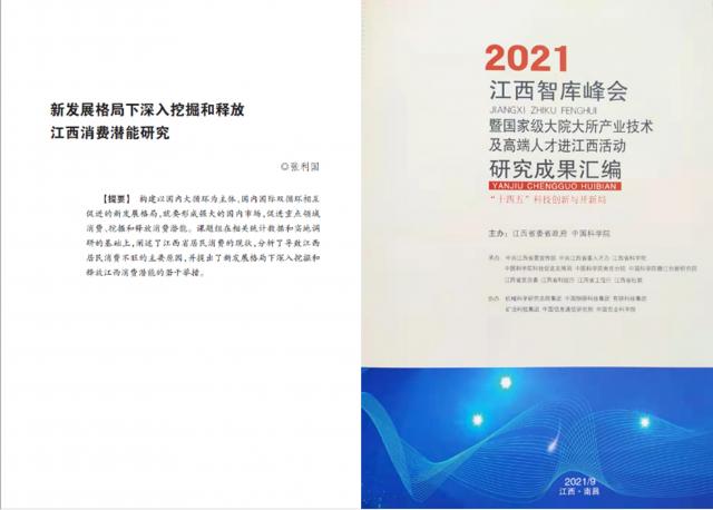 张利国教授团队的研究报告《新发展格局下深入挖掘和释放江西消费潜能研究》基于相关统计数据和实地调研资料,认为构建以国内大循环为主体、国内国际双循环相互促进的新发展格局,必然要形成强大的国内市场,促进重点领域消费,挖掘和释放消费潜能。研究报告阐述了江西省居民消费的现状,分析了导致江西居民消费不旺的主要原因,并提出了新发展格局下深入挖掘和释放江西消费潜能的若干举措。