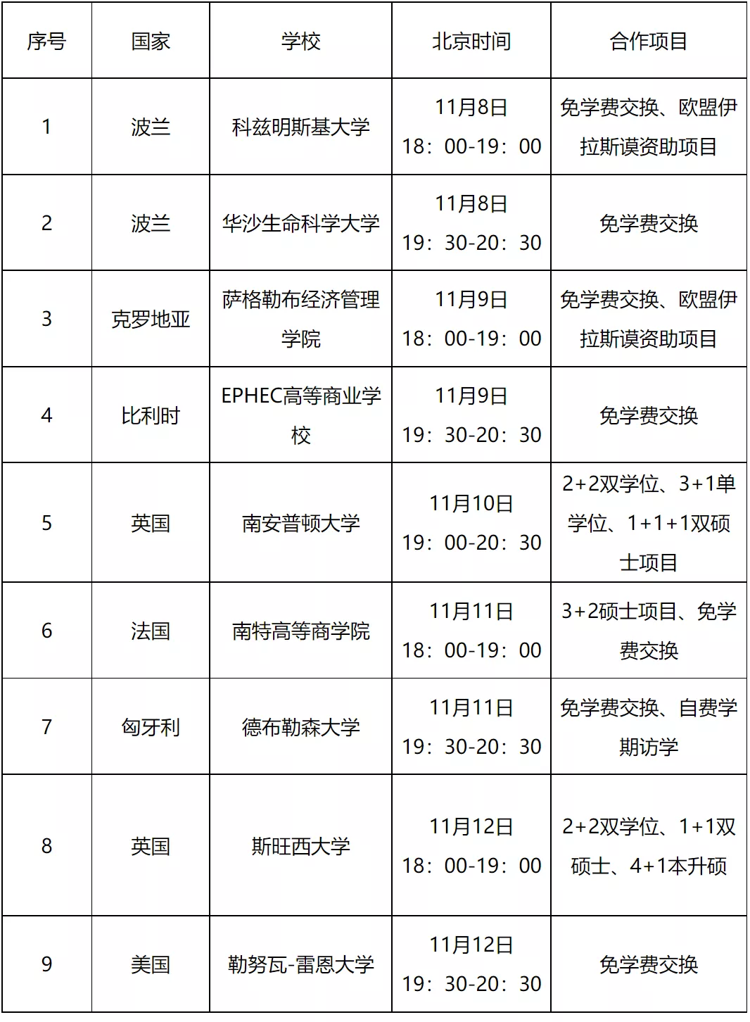因受新冠肺炎疫情影响,我校年度海外留学咨询展被迫取消。为在疫情期间给有意向赴海外留学的师生提供最新的官方留学资讯、解答师生对出国(境)留学的相关疑惑、给广大江财师生创造与海外合作院校沟通交流的机会,国际合作与交流处拟于11月8日至12日举办“云端逐梦”系列之2021年海外留学线上宣传周活动,具体事宜通知如下: