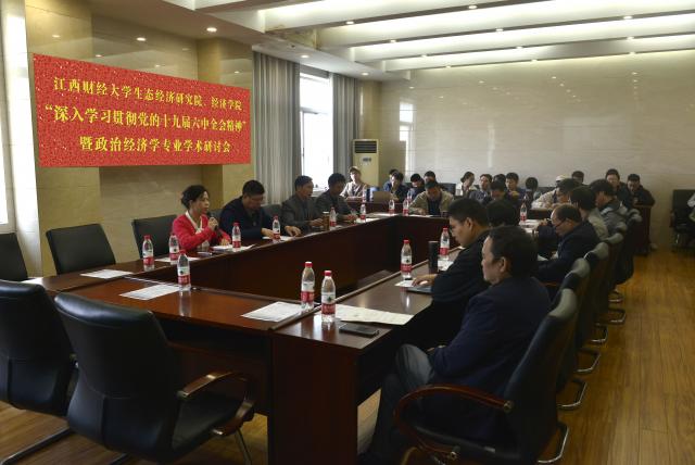 11月19日上午,由省哲学社会科学重点研究基地——生态经济研究院和经济学院联合主办的“深入贯彻党的十九届六中全会精神”暨政治经济学专业学术研讨会,于蛟桥园校区北区综合楼815会议室举行,院长张利国、党委书记邹春发参加会议,校内外40余名老师和学生参加了本次会议,副院长裘莹主持会议。