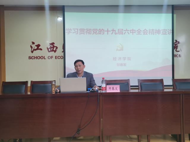 12月8日下午,经济学院于北综718会议室举办学习贯彻党的十九届六中全会精神宣讲会,宣讲会由经济学院党委书记邹春发主讲,学院学生党员、团干培训班全体成员到场聆听。