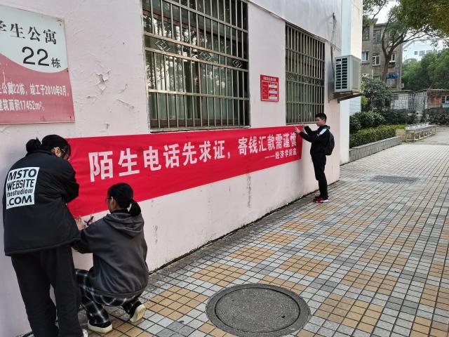 校风督察部的同学们通过张贴有关反诈基础知识的海报和横幅来加深同学们的印象,警示同学们要做到防微杜渐,不轻信,不理会,不贪小利。活动还向同学们分发了防范电信网络诈骗传单,让同学们更加详细了解常见骗术,防止上当受骗