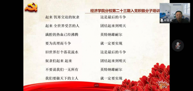 4月16日上午,经济学院举行第二十三期入党积极分子培训班开班典礼暨党校第一课。经济学院党委书记邹春发、党委副书记远翠平、党委组织委员吴佩芹出席,会议由吴佩芹同志主持。随着国际歌的奏响,会议正式开始。