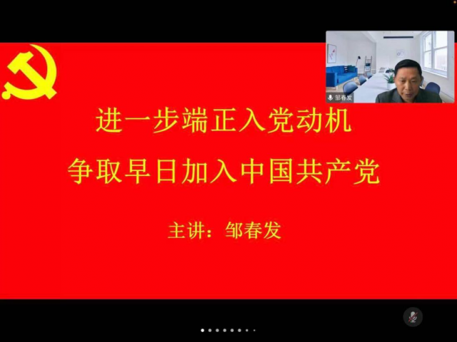 开班仪式结束后,邹春发书记讲授此次培训班第一讲内容:端正入党动机、争取早日加入中国共产党。从大学生身份的角度引领同学们形成正确的入党动机、积极创造入党条件,用实际行动实现自我价值。