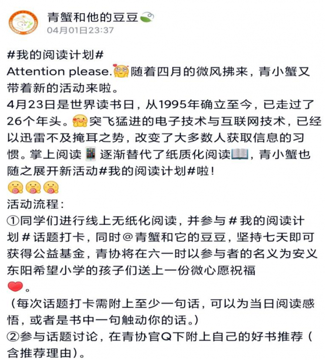 通过志愿者们的积极宣传,此次活动受到了全体同学的热烈响应。读书不是一朝一夕的事,而是终生的事业,为了让同学们更好的养成终身阅读,终身学习的良好习惯,本次活动要求参加了的同学们要通过线上打卡七天的方式完成每天的阅读任务。在同学们的积极响应下,该活动圆满完成,同时此次活动中完成阅读任务的同学获得的基金,也以参与者的名义捐献给了安义东阳希望小学的孩子们。