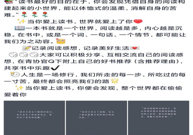 自古“书中自有颜如玉,书中自有黄金屋”,书籍是人类精神的食粮,是人类走向文明与进步的阶梯,是幸福和快乐之源。为了营造校园良好的阅读氛围,让同学们在疫情之间也不忘阅读,丰富疫情之下的校园生活,4月6日到4月18日,经济学院青年志愿者协会面向全校学生举行了“我的阅读计划”线上阅读活动。