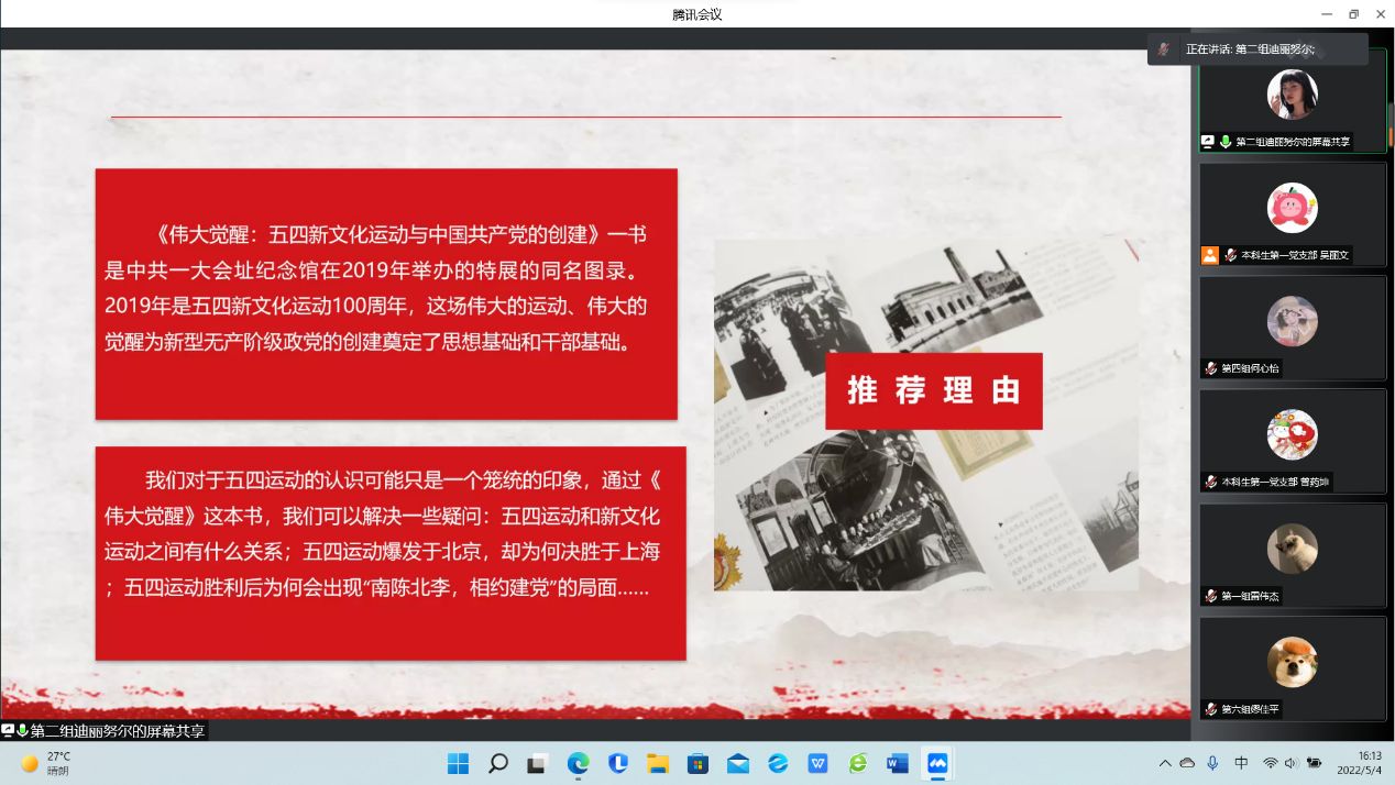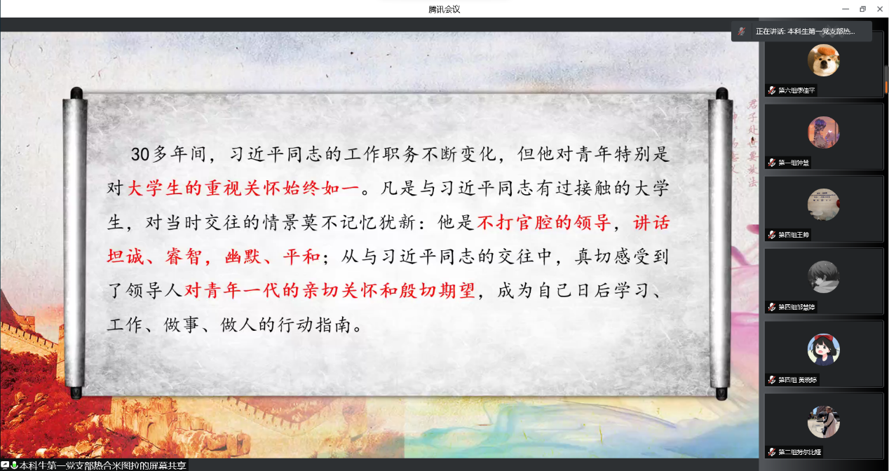 5月4日下午,经济学院本科生党支部以线上会议形式开展第二期“书香党建”活动。在“五四”青年节和少数民族学生传统节日“肉孜节”之际邀请了5名少数民族同学以“五四精神”为主题进行书籍展示和感悟分享。