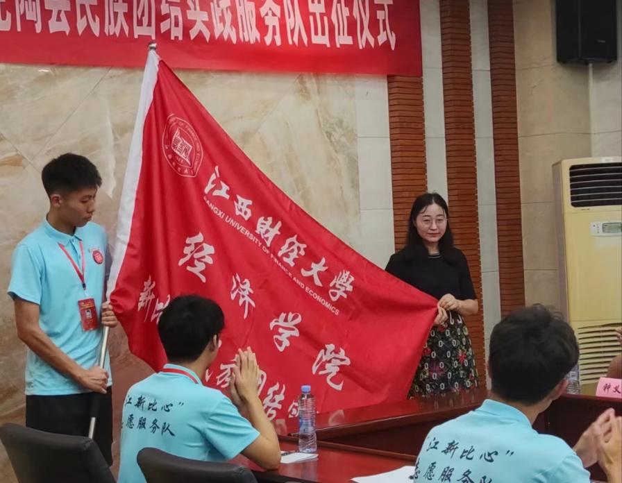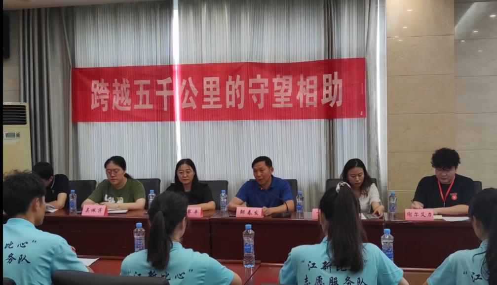 为让广大学子在社会课堂中“受教育、长才干、作贡献”,经济学院组建民族团结实践队第二次赴新疆开展暑期实习实践活动。7月5日上午,经济学院“江新比心”民族团结实践服务队在北区综合楼815隆重举行出征仪式。经济学院党委书记邹春发、党委副书记远翠平、团委书记万婧怡、学工办副主任吴佩芹、辅导员钟义鹏和民族团结实践服务队全体成员出席仪式。本次仪式由辅导员谢尔艾力主持。