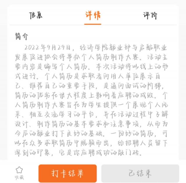 此次活动完美落幕,让同学得到充分表现自我机会、认清自己的不足与缺憾,从而有目的的培养能力、完善自我。使每位同学都拥有自己的求职简历,更科学合理地确定努力目标和方向,构筑自己的人生蓝图、放飞自己的梦想、实现自己的人生价值。(作者/张岩 李心如 作者单位/经济学院 图片作者/张岩 李心如 作者单位/经济学院)