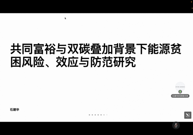 石建华老师的报告题目为《共同富裕与双碳叠加背景下能源贫困风险、效应与防范研究》,立足二十大报告精神“共同富裕在人民物质生活和精神生活方面都取得了新成效”和习近平总书记指出的“2020年全面建成小康社会后,我们将消除绝对贫困,但相对贫困仍将长期存在”、“中国二氧化碳排放力争于2030年前达到峰值,2060年前实现碳中和”重要论断,聚焦于能源贫困问题,研究能源贫困测度方法、碳约束对企业生产行为的影响以及进一步对城乡能源贫困的影响,从而给出能源贫困的防范机制及政策建议。