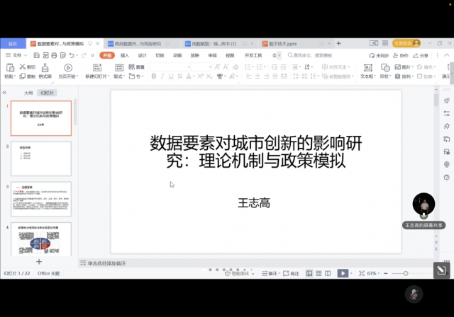 王志高老师作了题为《数据要素对城市创新的影响研究:理论机制与政策模拟》的报告,在数据合法使用的法律体系越加完善、数据应用地方法规层出不穷的背景下,结合二十大报告提出的“加快发展数字经济,促进数字经济和实体经济深度融合,打造具有国际竞争力的数字产业集群”,通过研究数据要素应用的创新案例,分析数据要素对城市创新的影响机制,并进行了数据要素对城市创新的实证分析与效应分析,最终结合不同的数据开放与共享模式场景,提出相应政策与建议。