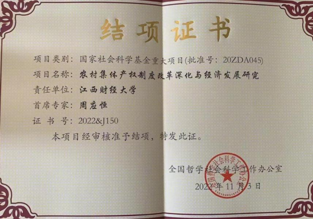 在江西财经大学、南京农业大学、南京航空航天大学、中国社会科学院农村发展研究所学者的共同努力和精诚合作下,该项目发表了30余篇学术论文,其中,被《人大复印报刊资料》全文转载1篇,被CSSCI收录25篇,被SSCI收录5篇。对策建议被国务院领导批示1件,被中央农办副主任、农业农村部党组副书记、副部长、国家乡村振兴局党组书记批示1件,被农业农村部采纳2件,被台盟中央采纳1件。成果要报得到省部级以上领导肯定性批示3件,其中,江西省副省长肯定性2件,江苏省副省长肯定性批示1件。该成果的最终成果将以《农村集体产权制度改革与集体经济发展研究》为名由中国财政经济出版社出版。