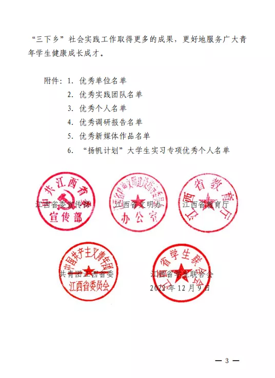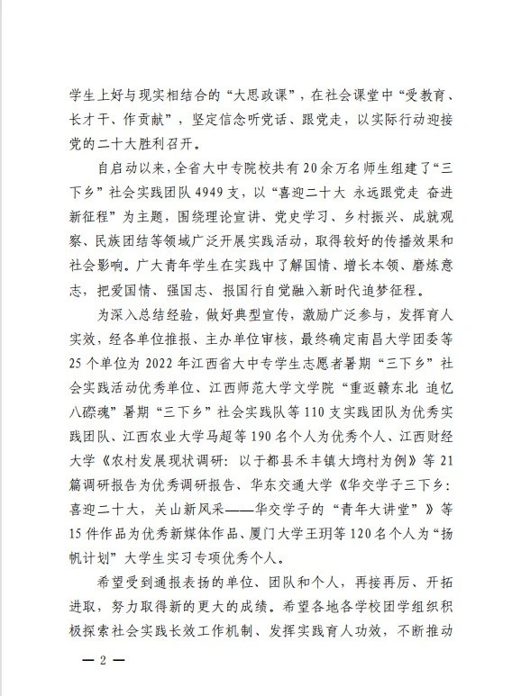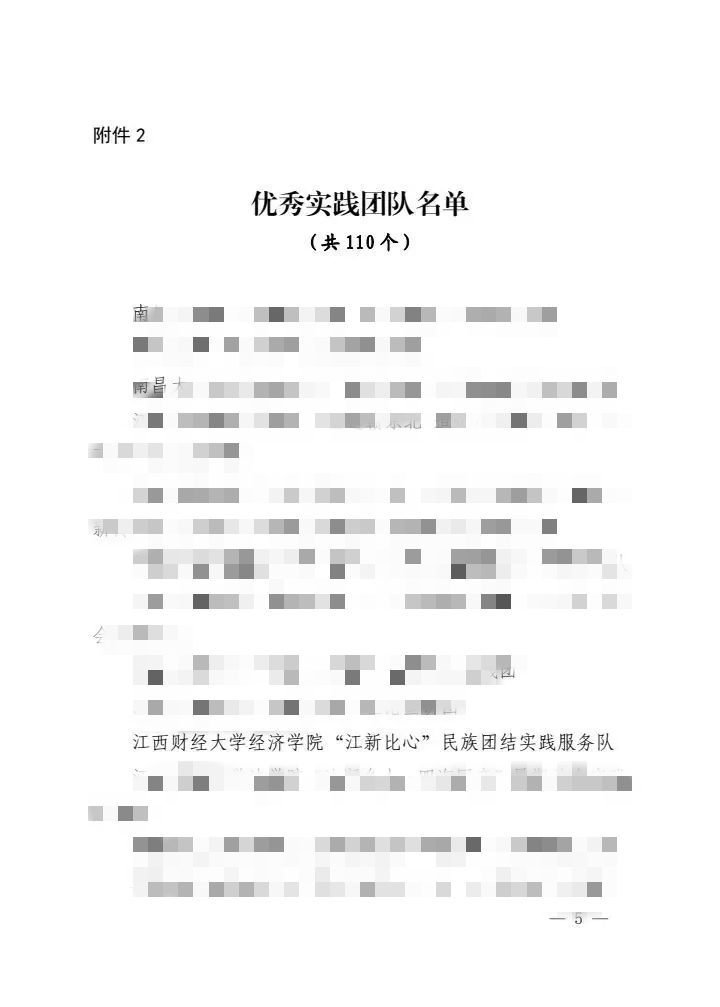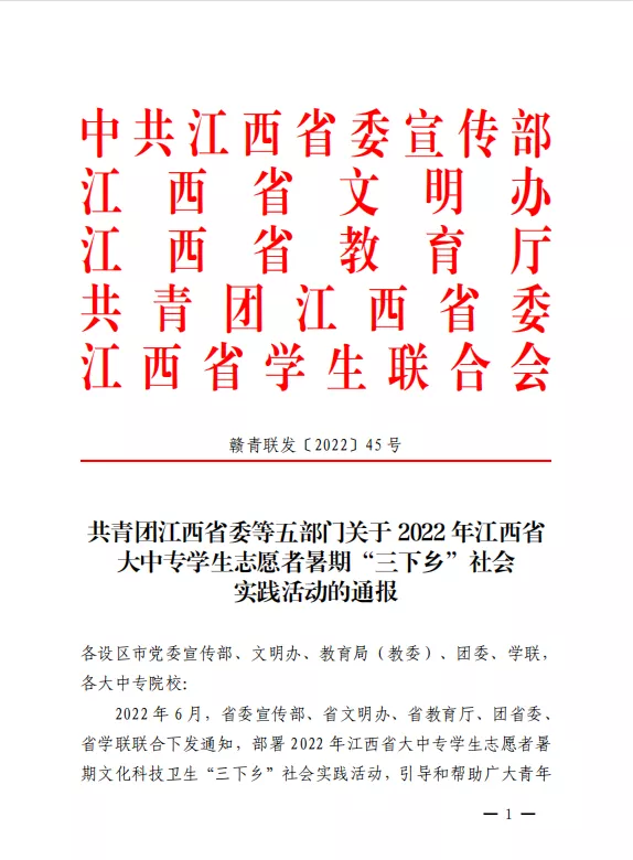 2022年12月9日中共江西省委宣传部、江西省文明办、江西省教育厅、共青团江西省委、江西省学生联合会关于2022年江西省大中专学生志愿者暑期"三下乡"社会实践活动的通报中,我院“江新比心”民族团结实践服务队荣获“优秀实践团队”称号。